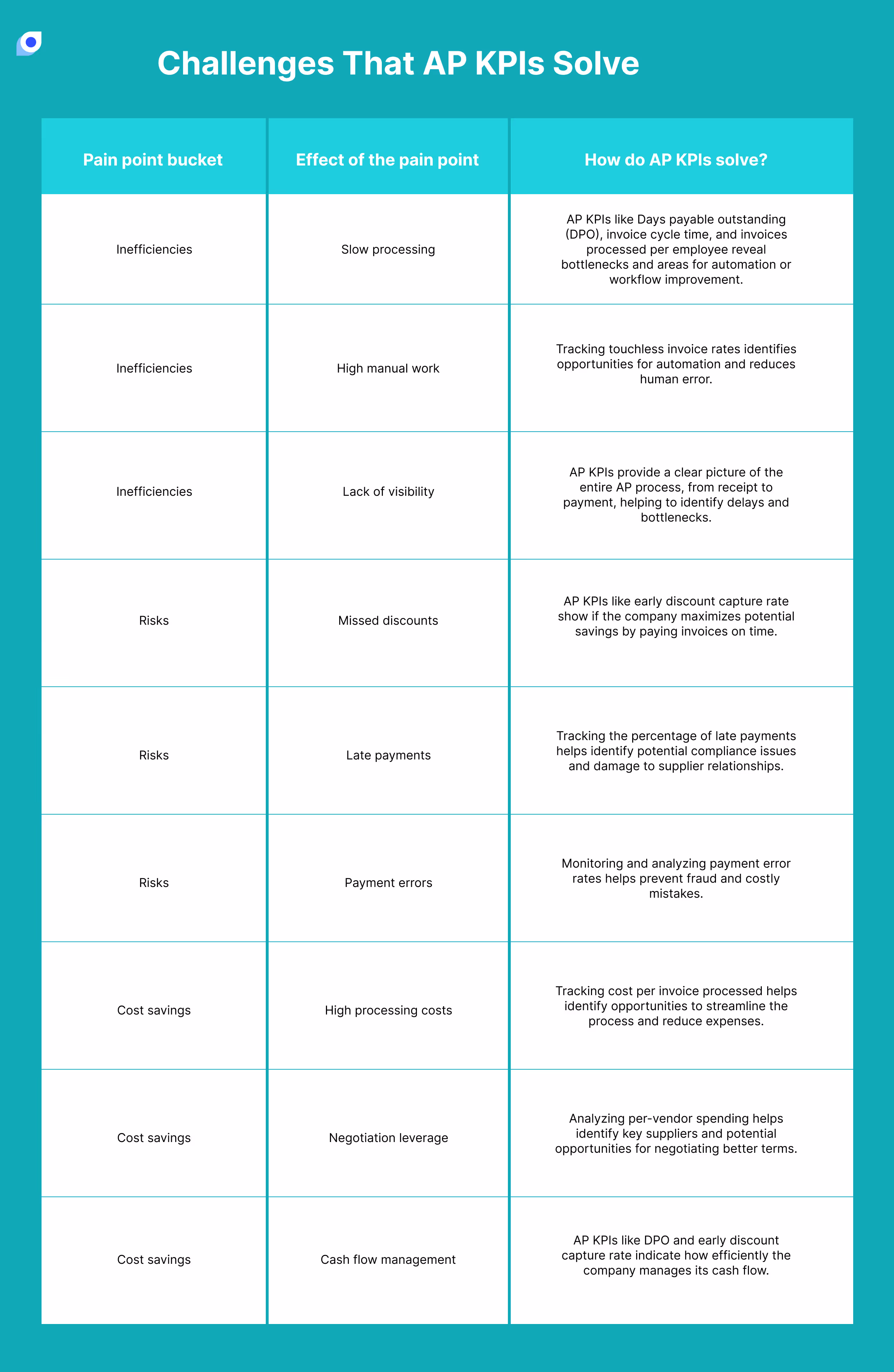 AP KPIs help business teams manage vendor relationships and manage liquidity. Regarding pain points that AP KPIs cure, it fixes inefficiencies and risks. It also renders a good amount of cost savings for your AP teams. Now, let’s delve into these buckets—