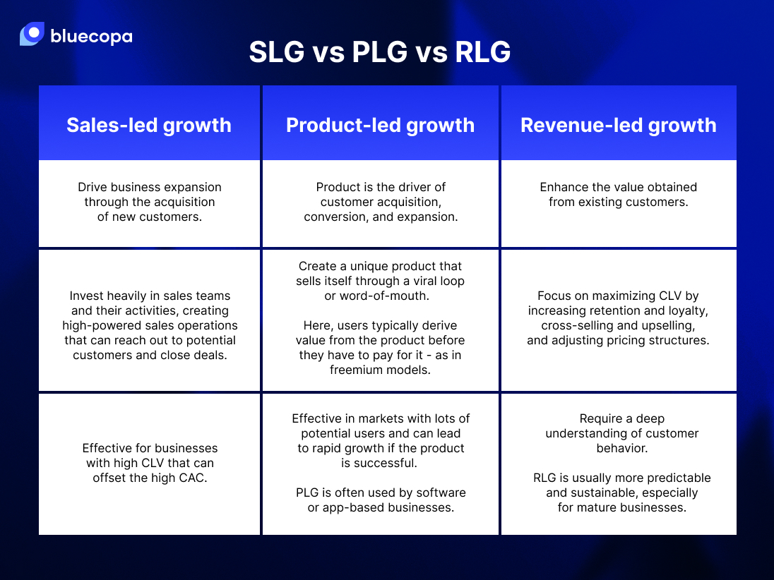 Sales-led growth (SLG), product-led growth (PLG), and revenue-led growth are common strategies that businesses deploy to appreciate and realize growth. Below, we delve deeper into their differences.